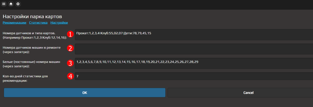- Кол-во дней которое будет использовать статистика для выдачи рекомендаций по использованию машин (для блока Статистика картов)